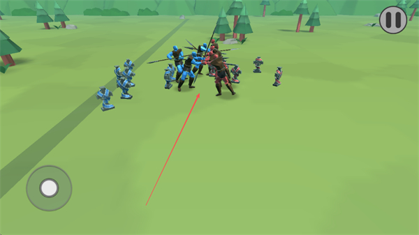 1、部署蓝色兵种与红色兵种在草地战场近战交锋,利用兵种数量和属性优势推进战线。