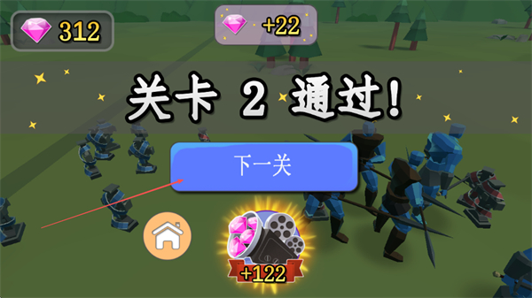 4、消灭所有红色敌人后,点击“下一关”进入后续关卡,继续挑战,积累钻石等奖励。
