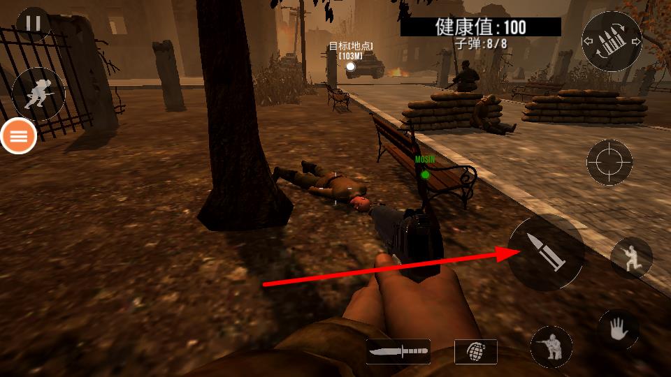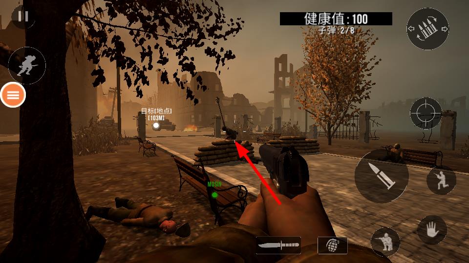 2、瞄准箭头指向的前方的敌人,进行射击可以消灭敌人,清除前进的障碍,保障自身的安全。