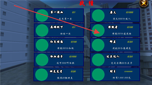 3、点击成就按钮,查看各项成就任务,如第一滴血需完成第一关,完成成就可获取奖励。