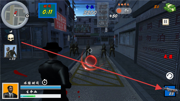 4、进入战斗场景,留意屏幕上方的时间、生命等信息,利用右下角武器按钮切换武器,消灭敌人通关。