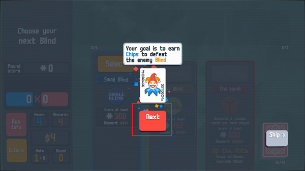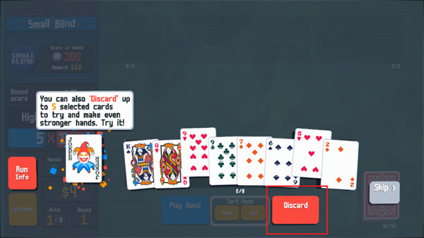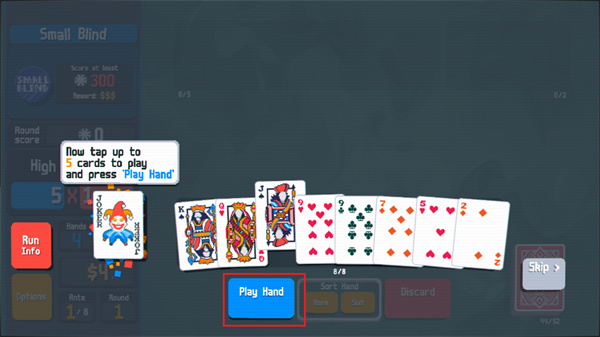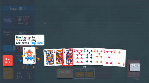 小丑牌中文版将采用最基础的扑克牌组成游戏内容,但是在这里不仅仅是简单的扑克玩法,将会带来更加烧脑的牌型组合玩法,让我们能够使用牌面上所有的牌去组成最高分的阵型,比如同花顺或者是对子、顺子等等牌型,都可以获得不同的分数,你的任务是通过出牌或者是弃牌拿到足够的分数就可以获得胜利。
