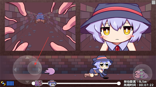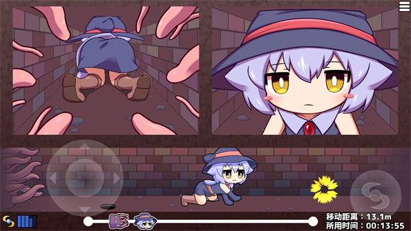 2、进入游戏关卡后,通过左侧移动摇杆操控角色移动,躲避场景内的怪物,推进移动距离以达成关卡进度。