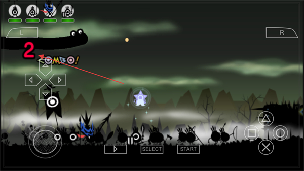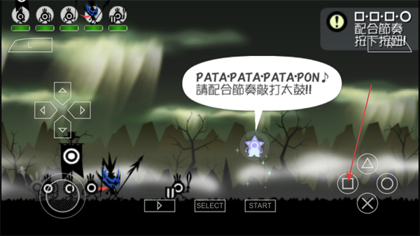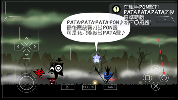 2、界面显示在旗手PON击打PATAPATAPATAPON弹奏时期按下o按钮,结合右上角弹窗出现的说明,在对应时机按下圆圈按钮。