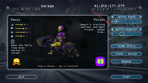 2、进入关卡后,在右上角的俩个设置中可以设定骑手的装备和颜色。