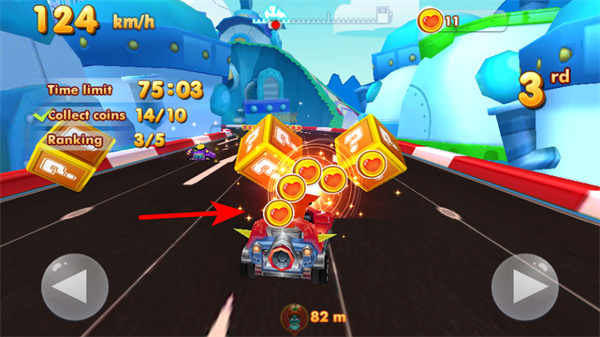 3、驾驶赛车撞击赛道上的道具如金币、爱心方块,可完成关卡目标,同时提升排名。