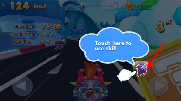 4、点击技能图标,助力快速通过赛道、获取更多道具,推进关卡的时间收集目标进度。