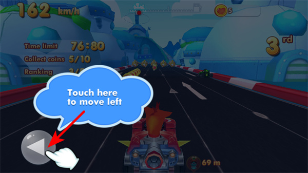 2、游戏中遵循操作规则,点击左侧的箭头按钮,可操控赛车向左移动,收集道具。