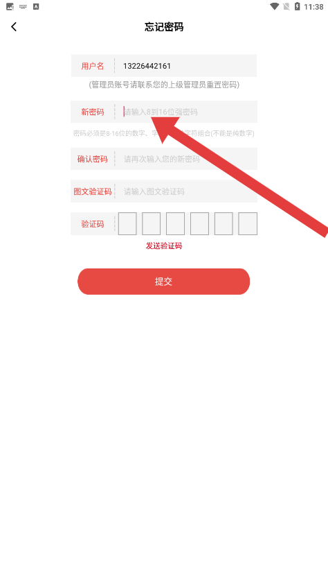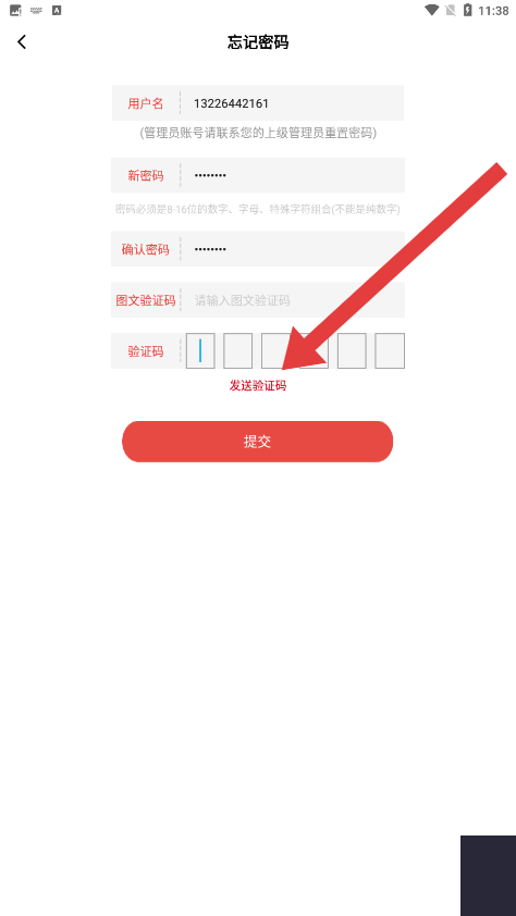 3、在输入完信息后,点击发送验证码按钮,获取后完成重置密码操作。