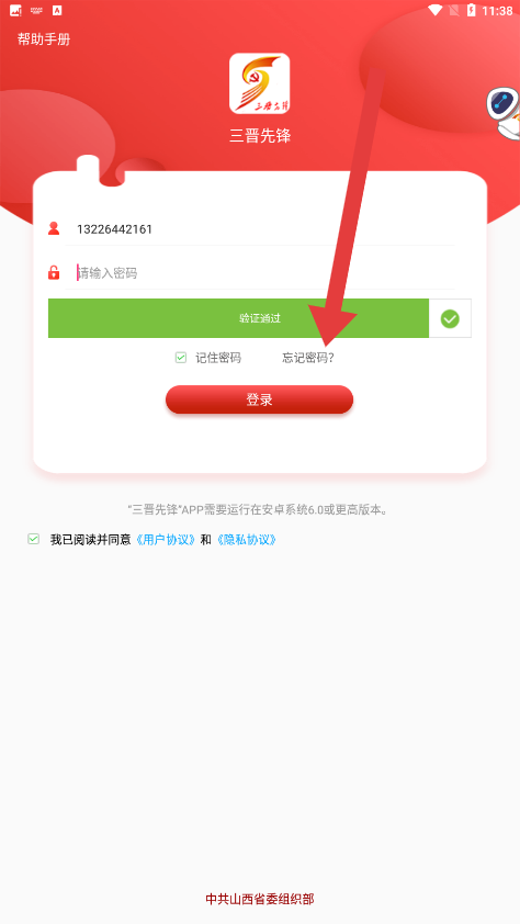 1、在三晋先锋登录页面中,若忘记密码可以点击下面的忘记密码按钮解决。