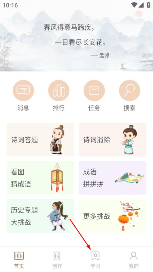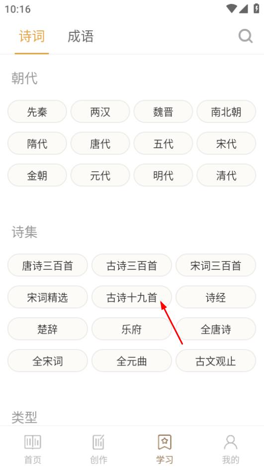 2、在学习页面,若想学习古诗十九首,可点击该选项。