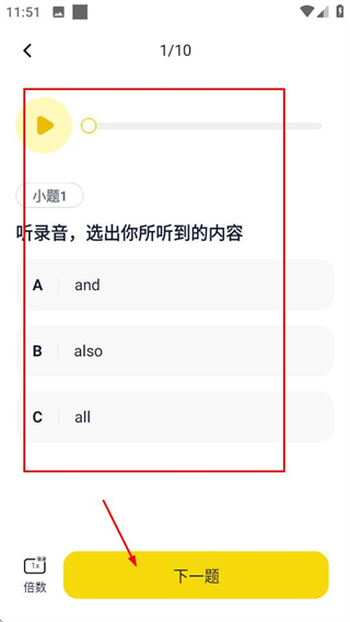 4、在作答界面,完成题目后点击下一题按钮,可继续完成后续听力题目。