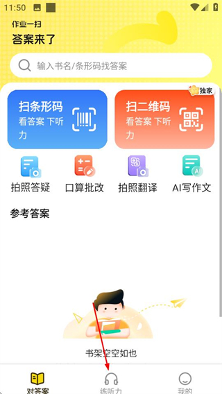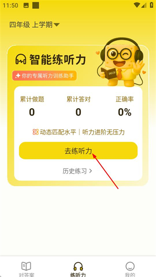 1、在答案来了首页,点击底部的练听力选项,进入听力练习页面。