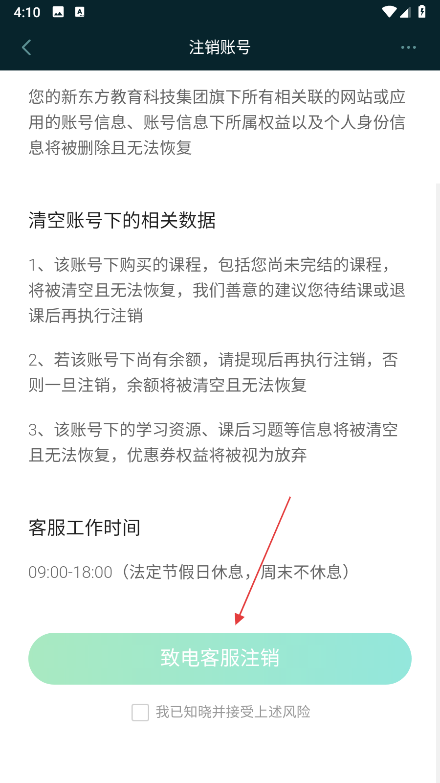 4、在注销账号页面,仔细阅读注销风险提示,勾选我已知晓并接受上述风险后,点击致电客服注销。