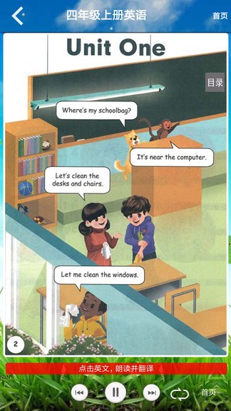 pep四年级英语上册君政教育人教版可以让学生们同步学习英语教材上的知识点。这个app完全同步了小学四年级英语课程内容,可以点读单词、词汇、课文内容。还附带了详细的课后习题解析内容。是小学生必备的英语点读app。