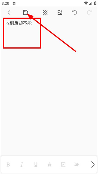 4、在笔记编辑界面,输入内容后点击保存图标,完成笔记编辑。