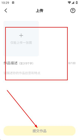 4、在上传页面上传图片,输入描述,点击提交作品完成上传。