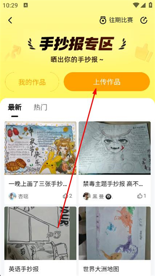 3、在手抄报专区,找到并点击上传作品按钮,进入上传页面。