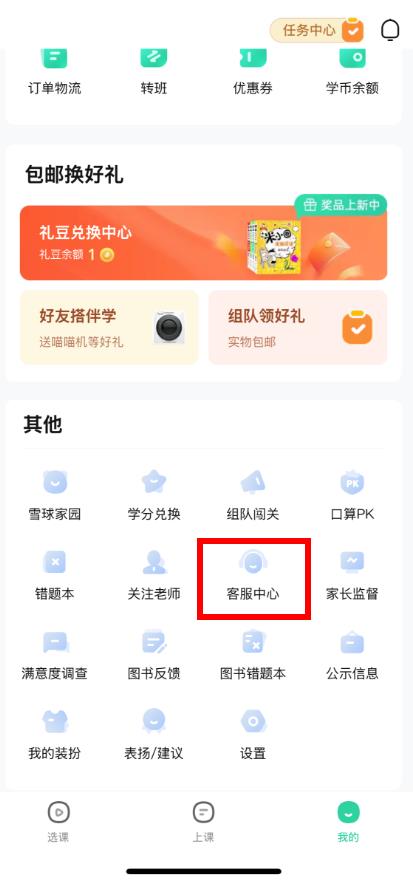 2、在个人页面其他板块中,找到并点击客服中心选项。