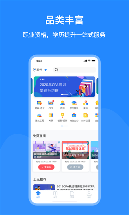 上元教育app是一款专业的职业培训教育应用,涉及会计、建筑、设计等多个职业领域,师资力量雄厚,经验丰富,用户随时随地都可线上学习咨询,有需要的朋友欢迎在下载使用!