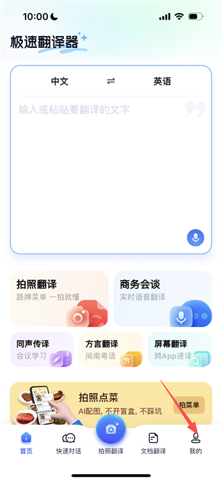 1、在极速翻译器首页,点击右下角我的选项,进入个人页面。