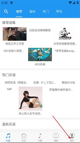 2、在吉他社首页,点击底部我的选项,进入个人页面。