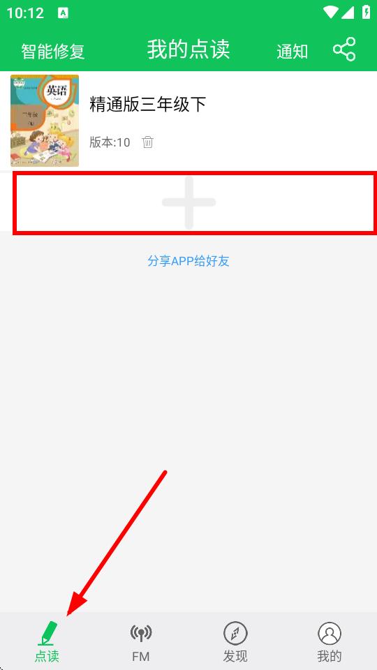 1、点击底部导航栏中的点读选项,在我的点读页面中,点击空白处的+图标,