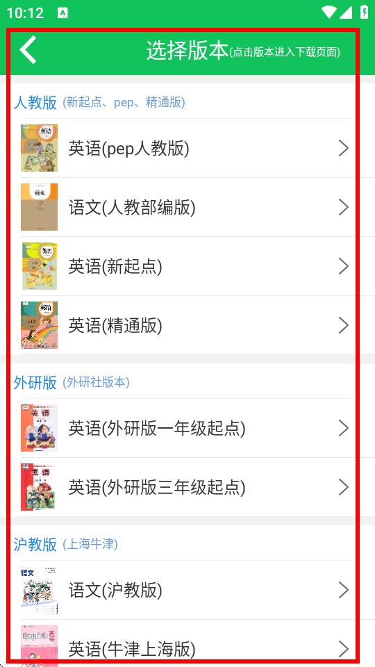 3、选择教材阶段后,进入选择版本页面,在该页面中点击想要的教材版本,进入下载页面完成选书操作。