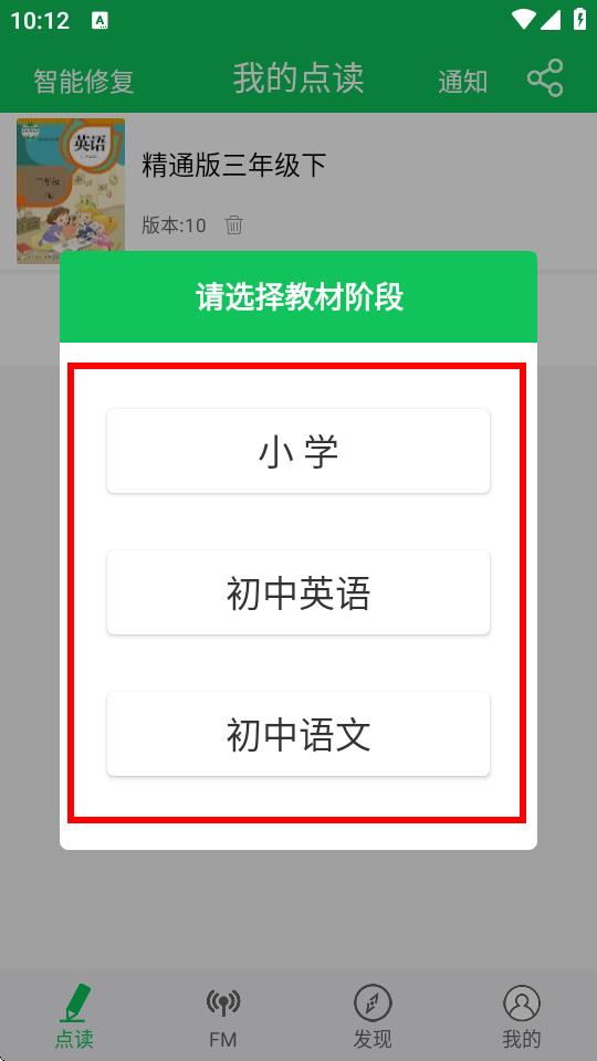 2、弹出请选择教材阶段窗口,选择小学、初中英语或初中语文等教材阶段。
