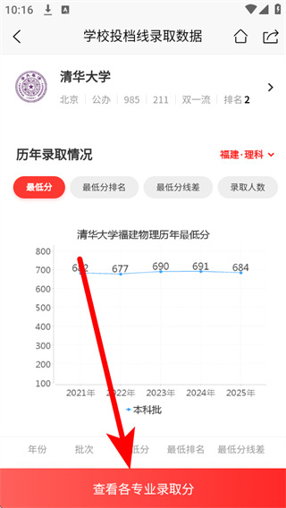 4、在数据页面,点击查看各专业录取分,即可查看该校各专业的具体录取分数信息。