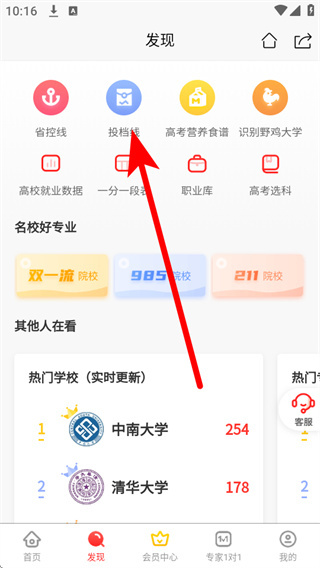 2、在发现页面中,找到并点击投档线,进入大学投档线查询界面。
