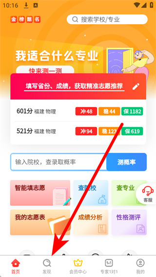 1、打开极志愿,点击底部导航栏的发现,进入发现页面。