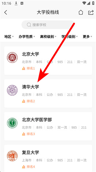 3、在大学投档线界面,选择目标学校,进入该校的投档线录取数据页面。
