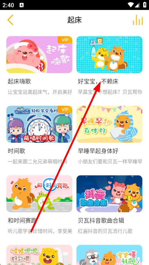 4、进入起床类别页面后,浏览并选择想听的儿歌,如点击好宝宝,不赖床,即可播放儿歌。
