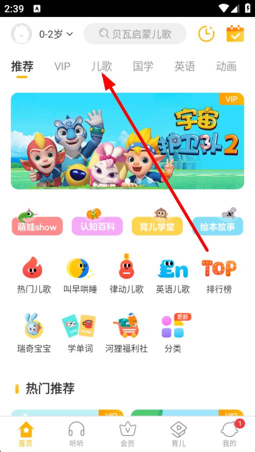 2、在首页点击上方儿歌栏目,进入儿歌分类页面。