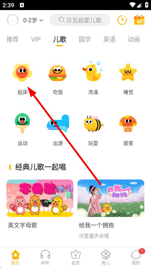 3、在儿歌分类页面,根据不同场景选择儿歌类别,如点击起床。