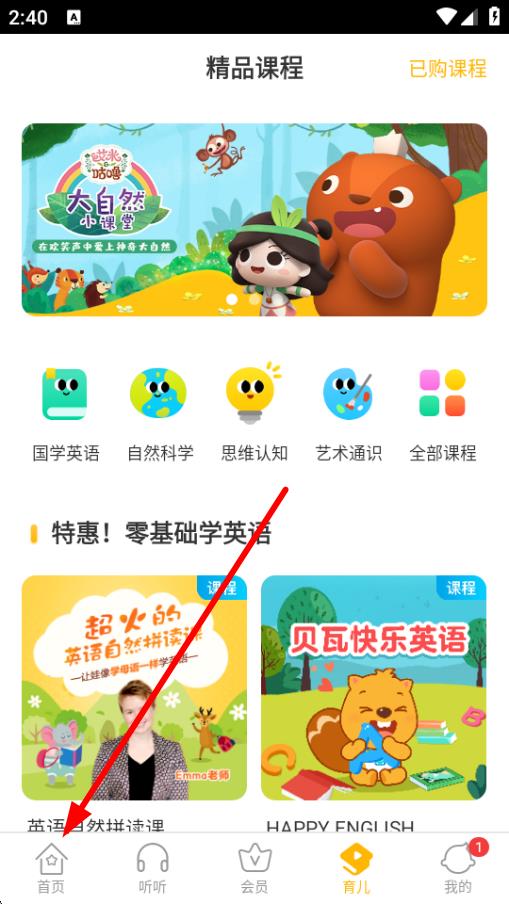 1、打开贝瓦儿歌App,点击底部首页页面进入。