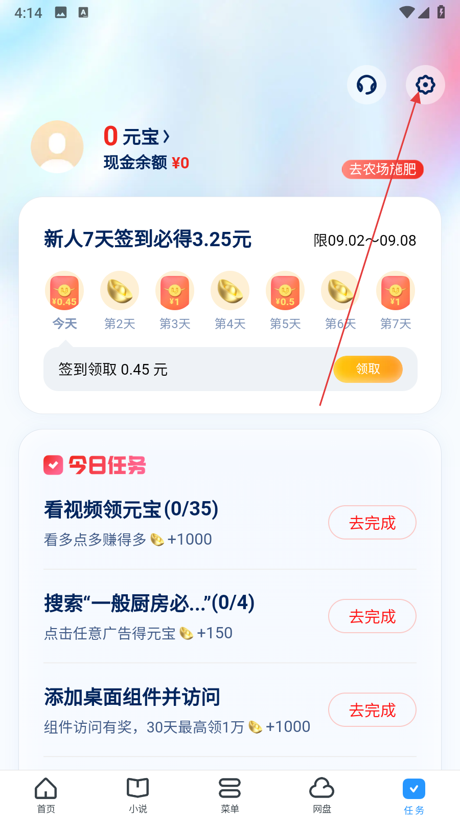 1、打开UC浏览器极速版,进入任务页面,点击右上角齿轮状设置图标,进入更多设置页面。