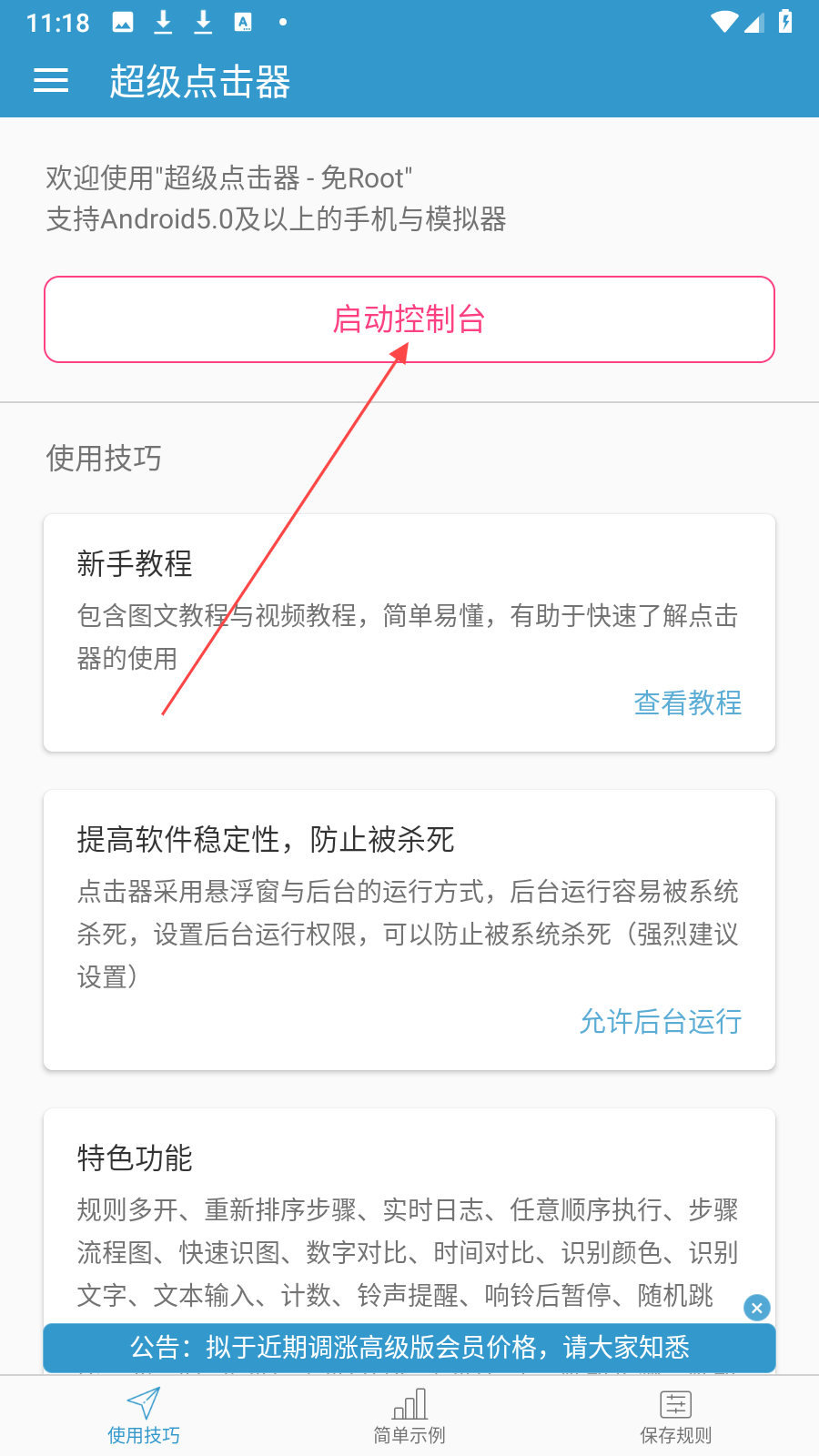 1、打开超级点击器应用,进入主界面后,点击启动控制台按钮,准备开启后续权限设置流程。