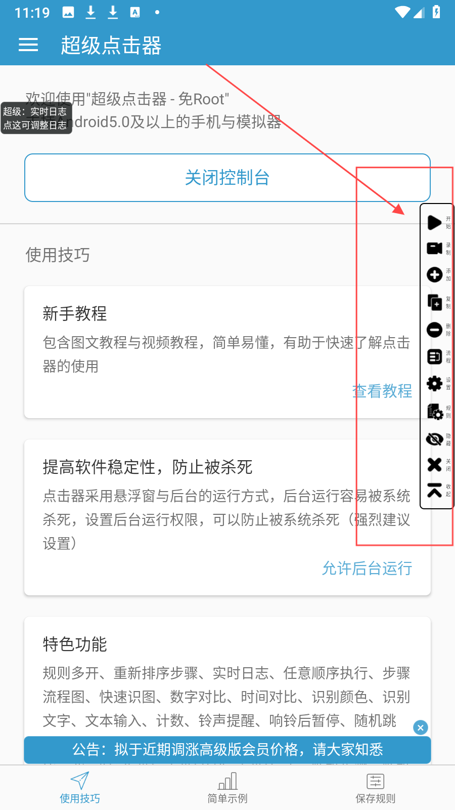 3、成功开启权限并启动控制台,出现悬浮控制台窗口,点击开始可按规则点击,录制能录点击流程,添加可手动加操作步骤,也能通过设置调整点击间隔等参数。