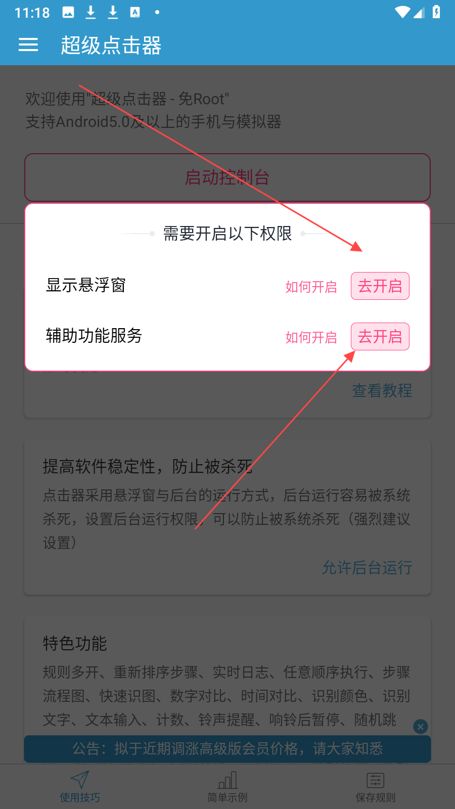 2、点击启动控制台后,会弹出权限提示,分别点击显示悬浮窗和辅助功能服务右侧的去开启,按系统引导完成对应权限开启,为正常运行做好准备。