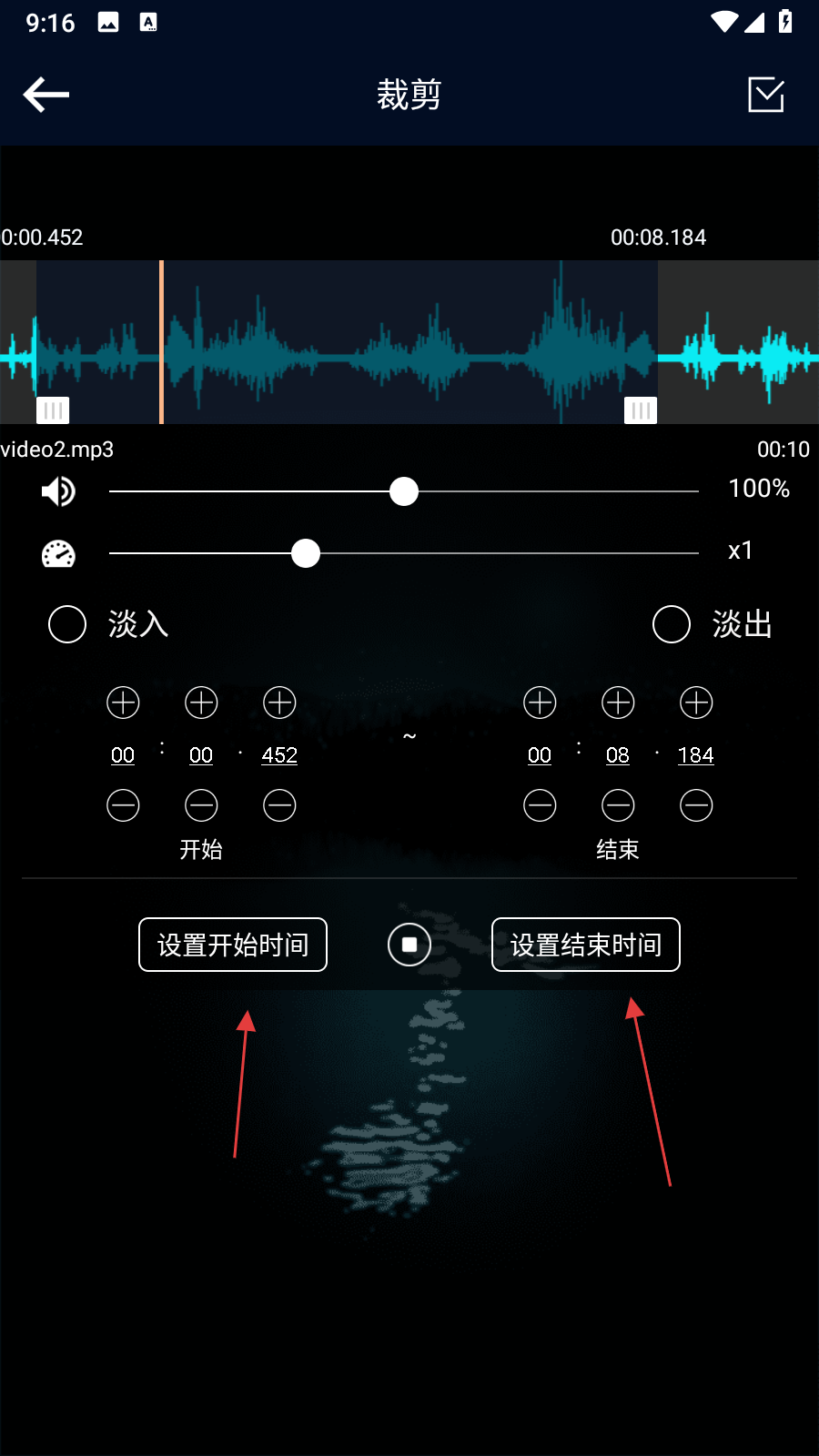 3、手动设置截取的开始和结束时间,精准到0.1秒,根据需求进行设置淡入淡出等参数设置。