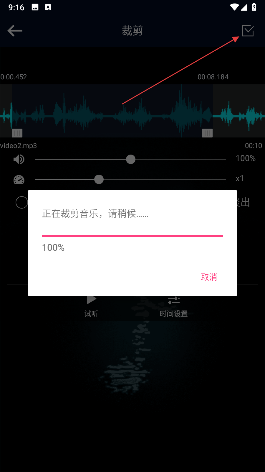 2、在音频剪辑界面,可通过滑动音轨定位到需要剪辑的位置,或者点击时间设置。