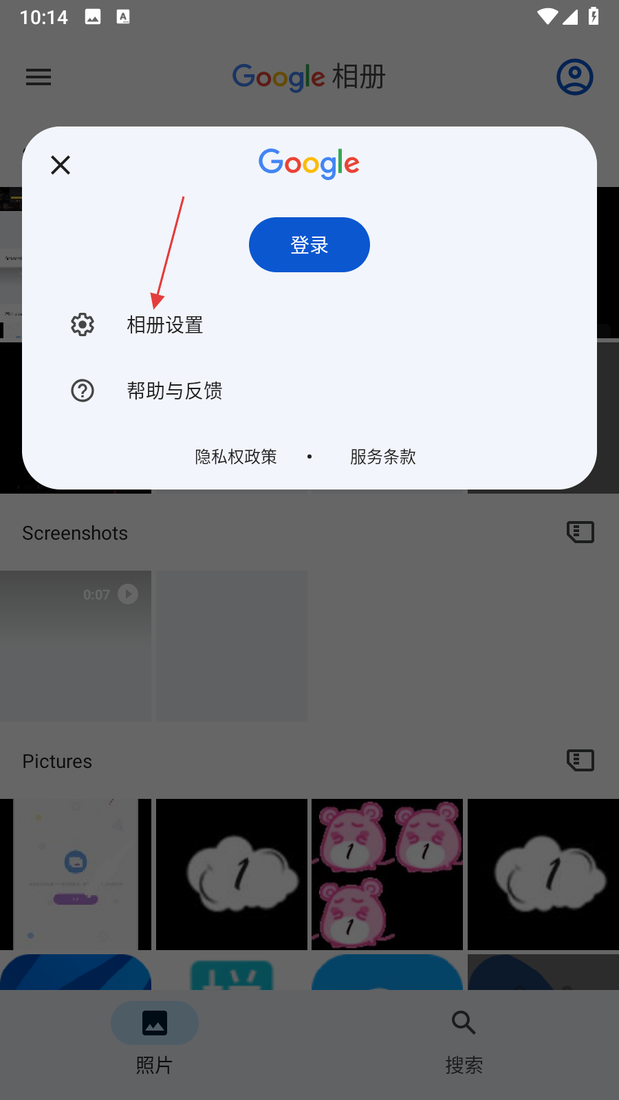 2、在弹出的菜单中,点击相册设置选项,进入谷歌相册的设置页面。