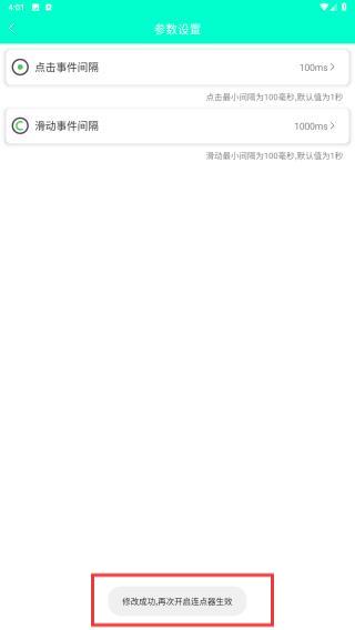4、点击后,在页面内会弹出修改成功,再次开启连点器生效的提示。