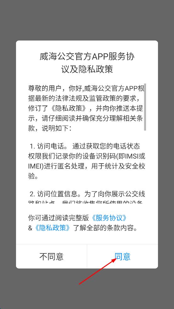 1、打开威海公交官方APP,在服务协议及隐私政策界面,仔细阅读相关内容后,点击同意,进入APP主界面。