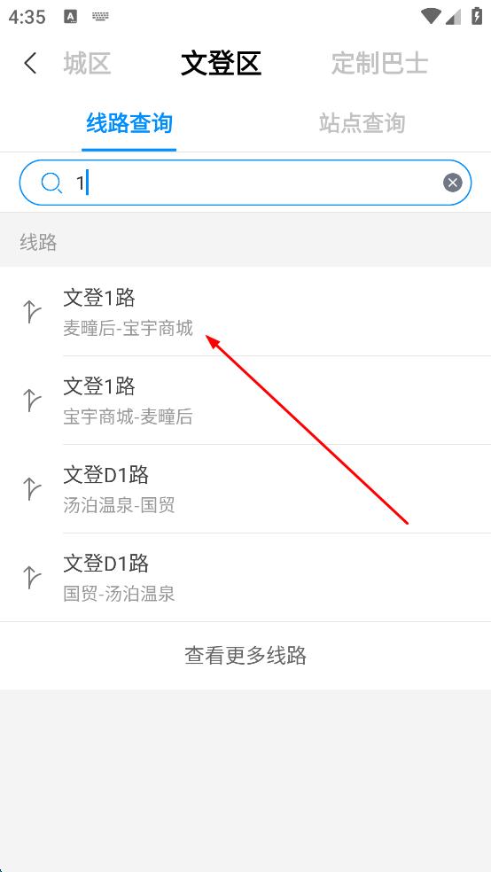 3、在实时公交页面,选择文登区,进入文登区公交查询页面,在搜索框输入公交线路相关信息,比如输入1,查找对应的公交线路。
