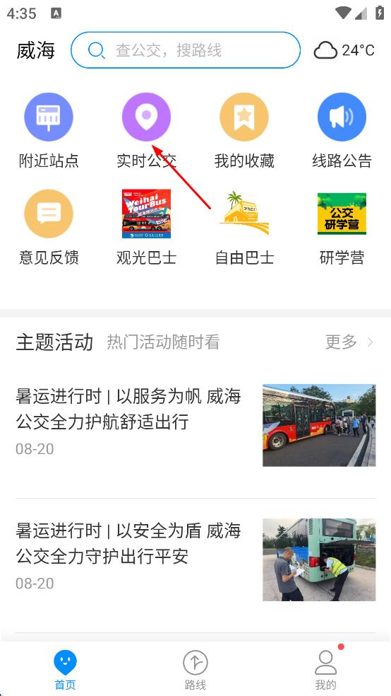 2、在APP主界面,点击实时公交选项,进入实时公交页面,可查看不同城区的公交信息。