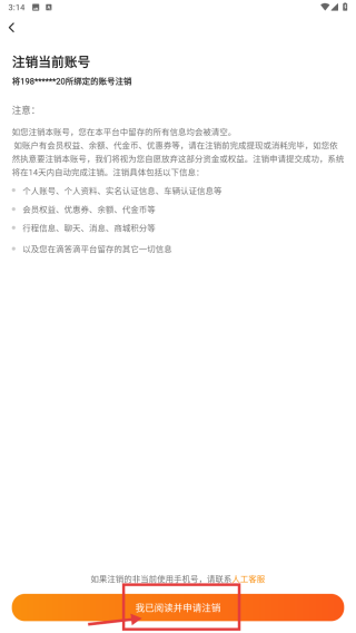 4、确认注销账号说明后,点击我已阅读并申请注销按钮,提交账号注销申请。
