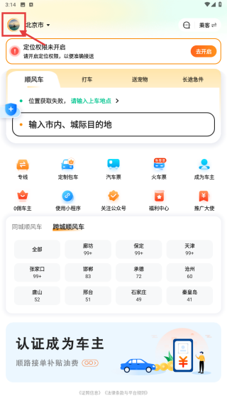 1、打开出行类APP,点击左上角个人头像,进入个人中心页面。